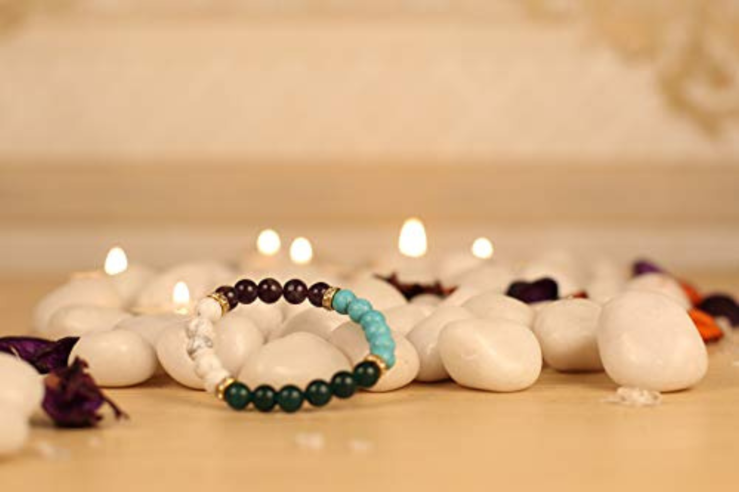 - BENEFITS: Wearing Bracelet helps you to sync with the energy of that particular stone. Jade – Jade strengthens your mental faculties and assists in clear reasoning. Turquoise – Oldest stone in man’s history. Protector and guardian of the body and soul. Howlite is known as a soothing and calming stone and helps with an overactive mind and insomnia. Amethyst is used for Inspire and encourage meditation, selfless giving, and service to humanity
