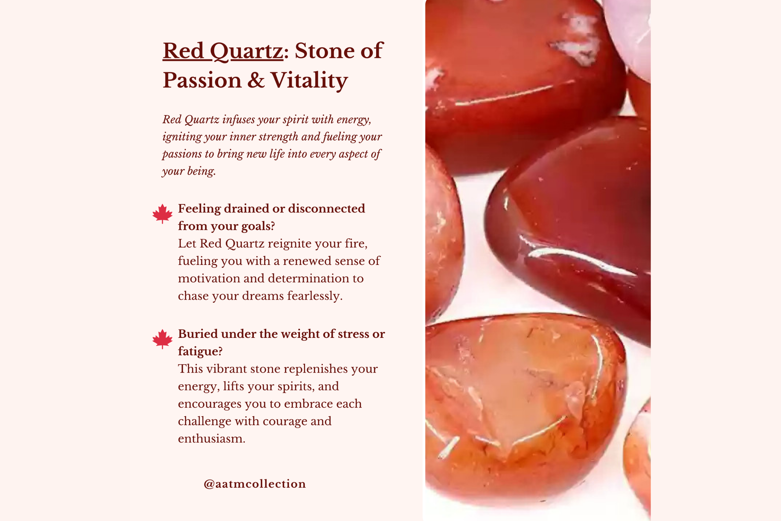 - BENEFITS: A pyramid is a source of attracting the highest cosmic energy. Red Quartz – Stone of Willpower and Creativity. Also known as tangerine quartz or strawberry quartz. It’s a good stone for those who want to activate “Law of Attraction”. Red quartz promotes action and drive. Its red color ray produces an abundance of energy, strength, and vitality.